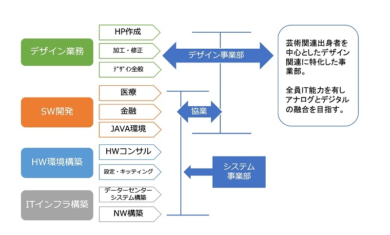 社員それぞれのスキル派生により様々な事業を行っています。